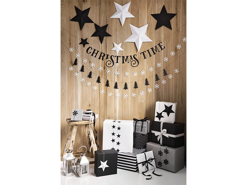 Dekoracja Gwiazdy w kolorze białym, do samodzielnego złożenia, w zestawie gwiazdy o wymiarach ok.: 37 x 35 cm, 33 x 31 cm, 28,5 x 27,5 cm, 16 x 15 cm, 14 x 13,5 cm, 12 x 11,5 cm i srebrny sznurek.