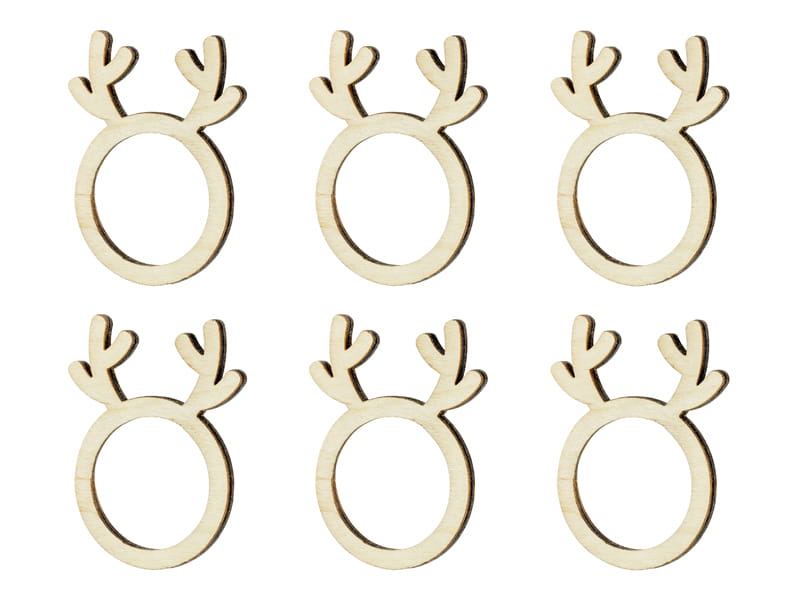 Drewniane obrączki na serwetki w kształcie reniferów, wymiary ok. 6 x 7.5 cm, średnica otworu ok. 4 cm.