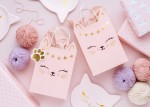 Torebki na prezenty w kolorze różowym z nadrukiem i zawieszką w kształcie łapki kotka oraz nadrukiem, wymiary bez uchwytów ok. 18 x 10,5 x 27,5 cm.