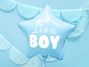 Balon foliowy pastelowy Gwiazdka w kolorze jasnoniebieskim z białym napisem It’s a boy, rozmiar ok. 48 cm (19”).