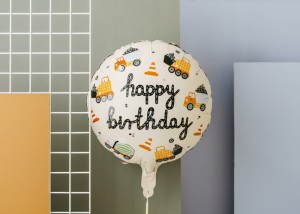 Balon foliowy okrągły Pojazdy budowlane, mix kolorów, wymiary przed napompowaniem ok. 45 cm (18”), wymiary po napompowaniu ok. 35 cm (14”). Do napompowania powietrzem i helem. Zestaw zawiera słomkę.
