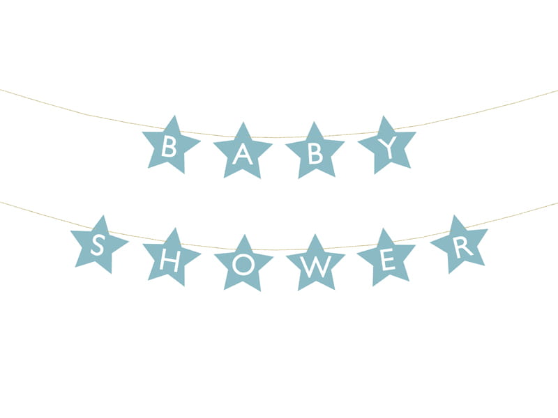 Baner w kształcie gwiazdek z napisem Baby Shower wykonany z papieru w kolorze jasnoniebieskim, wymiary sznurka ok. 3m.