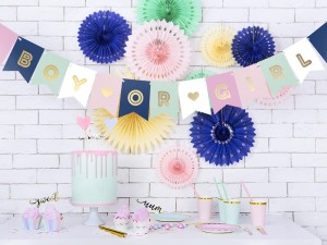 Baner Boy or Girl, mix kolorów ze złotym napisem, do samodzielnego złożenia, zestaw zawiera literki i ok. 2,5 m białej tasiemki, wymiary po złożeniu: wysokość ok. 15 cm, długość ok. 175 cm.