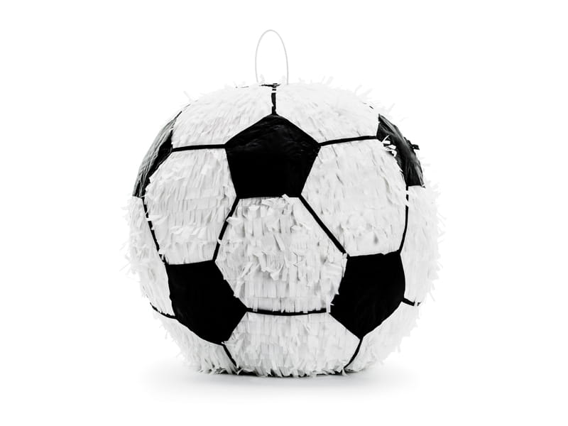 Piniata w kształcie piłki nożnej w białym kolorze z czarnymi elementami, do wypełnienia upominkami, wymiary ok. 35 x 35 x 35 cm.