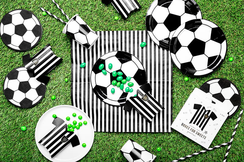 Opakowanie zawiera 6 sztuk, co pozwala łatwo zaplanować dekorację stołu lub rozdać małe upominki uczestnikom wydarzenia. To także świetna propozycja na zakończenie imprezy – każdy z gości może zabrać ze sobą pamiątkę. Pudełeczka pasują do innych akcesoriów z motywem futbolowym, które znajdziesz w naszej kategorii dekoracje piłkarskie.