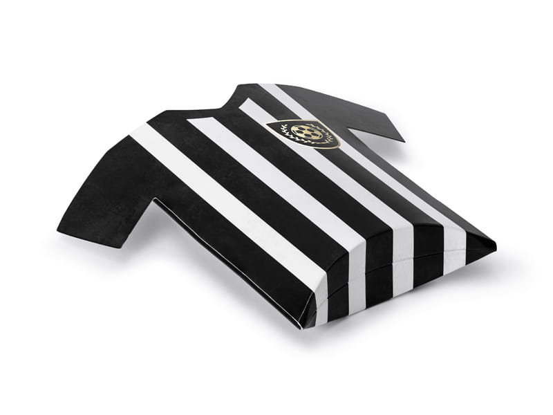 Pudełeczka Koszulki piłkarskie to oryginalny i stylowy dodatek do każdej imprezy z motywem piłki nożnej. Wykonane w kształcie sportowej koszulki, w klasycznym białym kolorze z czarnym i złotym metalizowanym nadrukiem, świetnie podkreślają piłkarski klimat przyjęcia. Każde pudełko po złożeniu ma wymiary ok. 12 x 11 x 2,5 cm, co sprawia, że idealnie nadaje się na drobne upominki, słodycze lub gadżety dla gości.