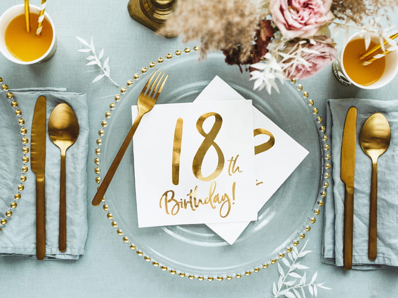 Serwetki papierowe 18th Birthday w kolorze białym ze złotym wzorem, wymiary po rozłożeniu ok. 33 x 33 cm, wymiary po złożeniu ok. 16,5 x 16,5 cm.n