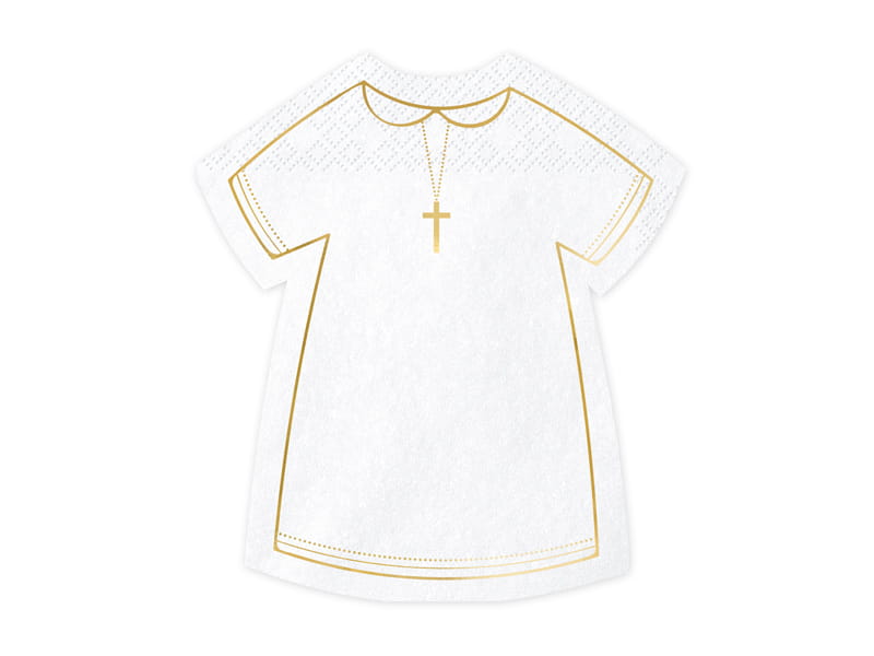 Serwetki papierowe w kształcie alby komunijnej w kolorze białym ze złotym metalizowanym nadrukiem, wymiary po rozłożeniu ok. 28 x 32 cm, wymiary po złożeniu ok. 14 x 16 cm.