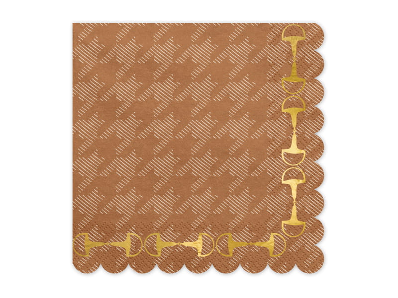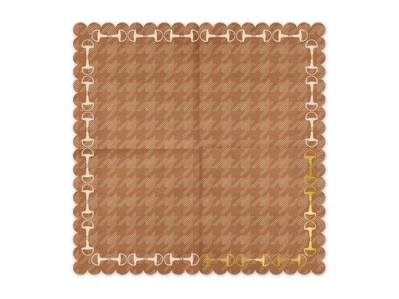 Brązowe, papierowe serwetki w pepitkę ze złotym, błyszczącym nadrukiem strzemion. Wymiary po rozłożeniu ok. 33 x 33 cm, wymiary po złożeniu ok. 16.5 x 16.5 cm.