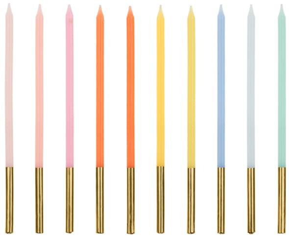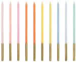 Świeczki urodzinowe gładkie, mix kolorów ze metalizowaną złotą końcówką, wysokość ok. 14 cm.