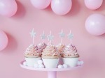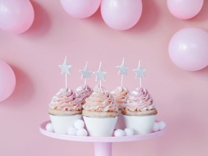 Świeczki urodzinowe Gwiazdki w kolorze srebrnym brokatowym, wysokość ok. 3.5 cm.