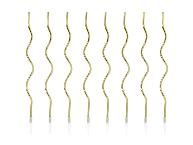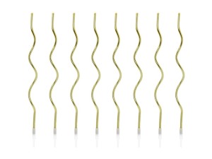 Świeczki urodzinowe zakręcone, w kolorze złotym metalizowanym, wysokość ok. 14 cm. Zestaw zawiera 8 świeczek i podstawek.